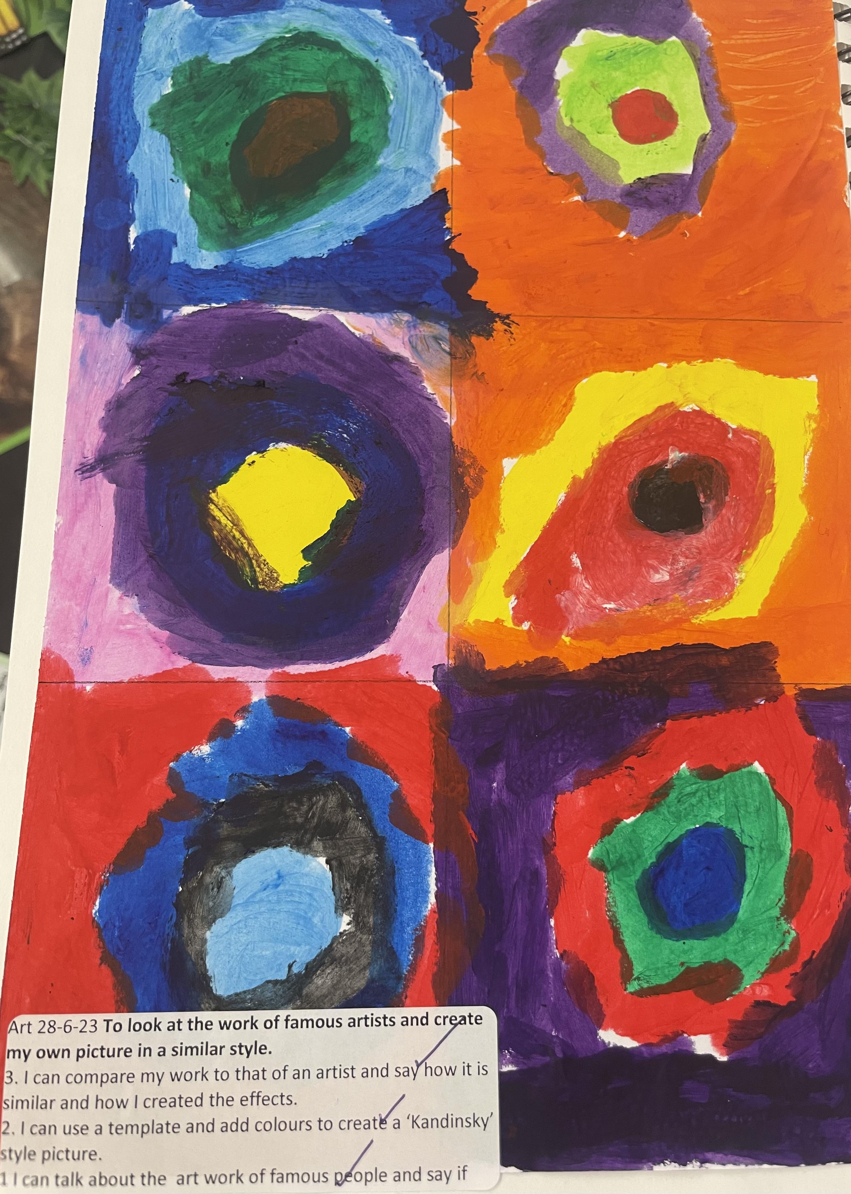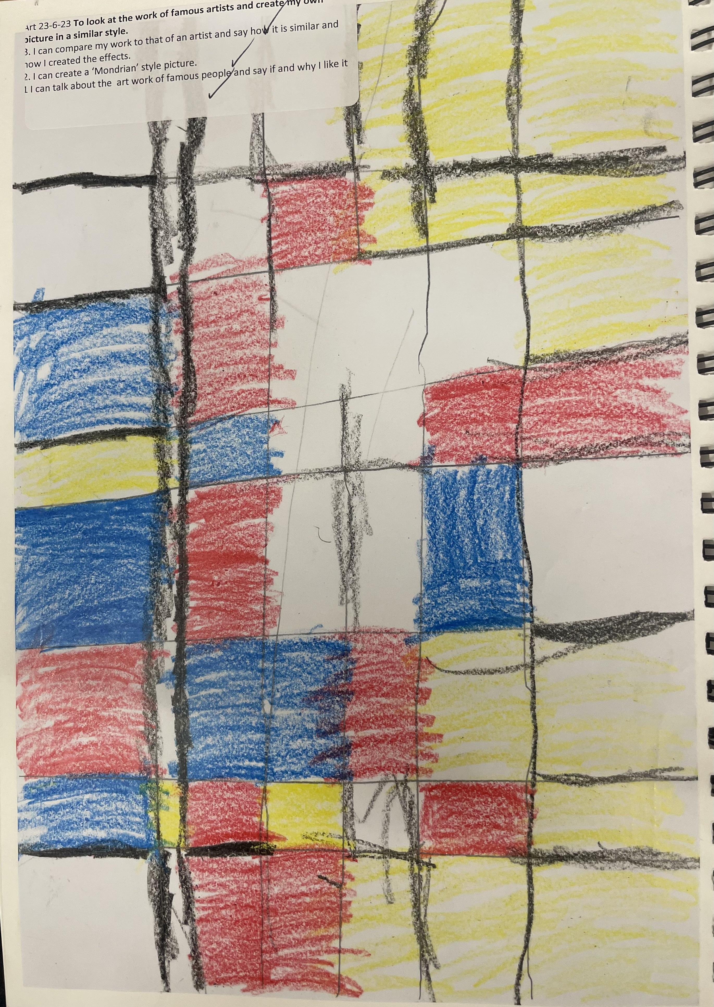 Children in years 1 and 2 begin to use sketchbooks to record their ideas and pieces of artwork. They have been exploring the work of Mondrian, Kandinsky and Picasso and creating their own artist inspired pieces.