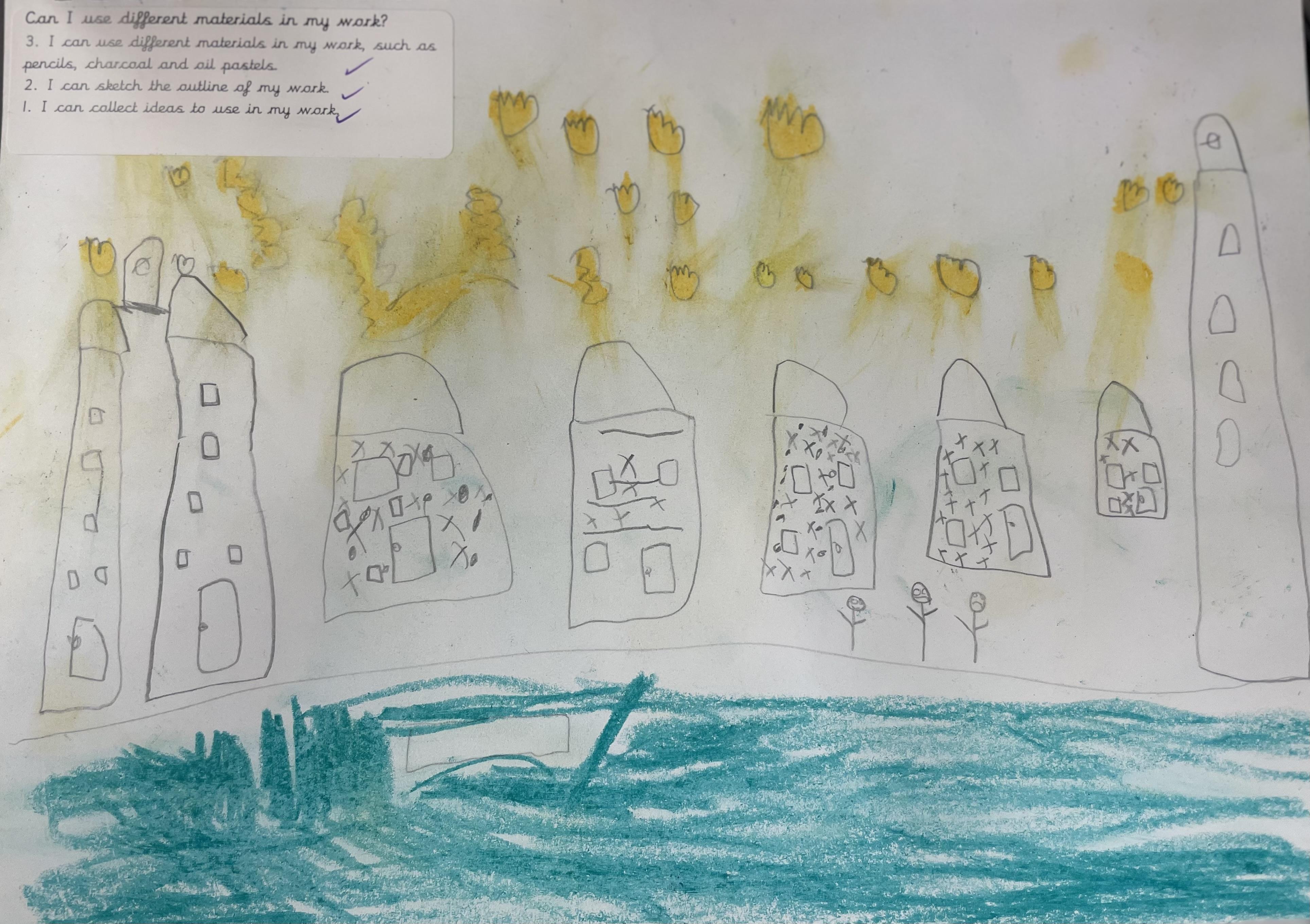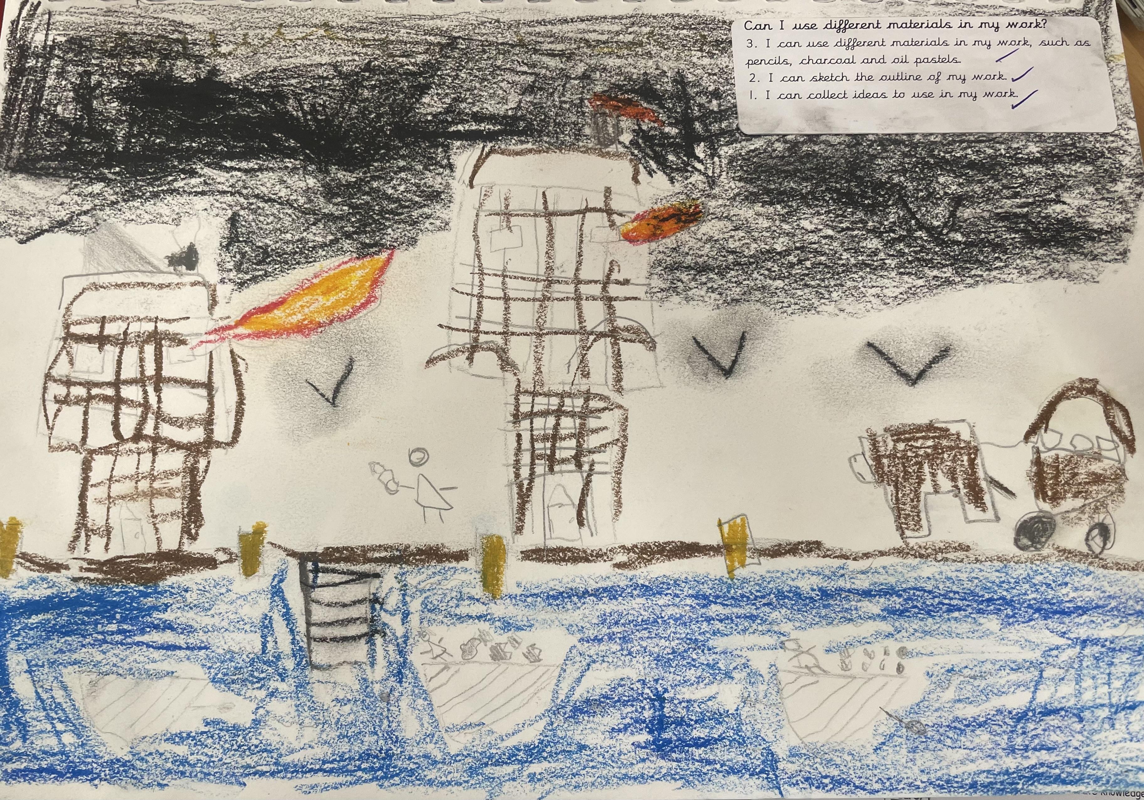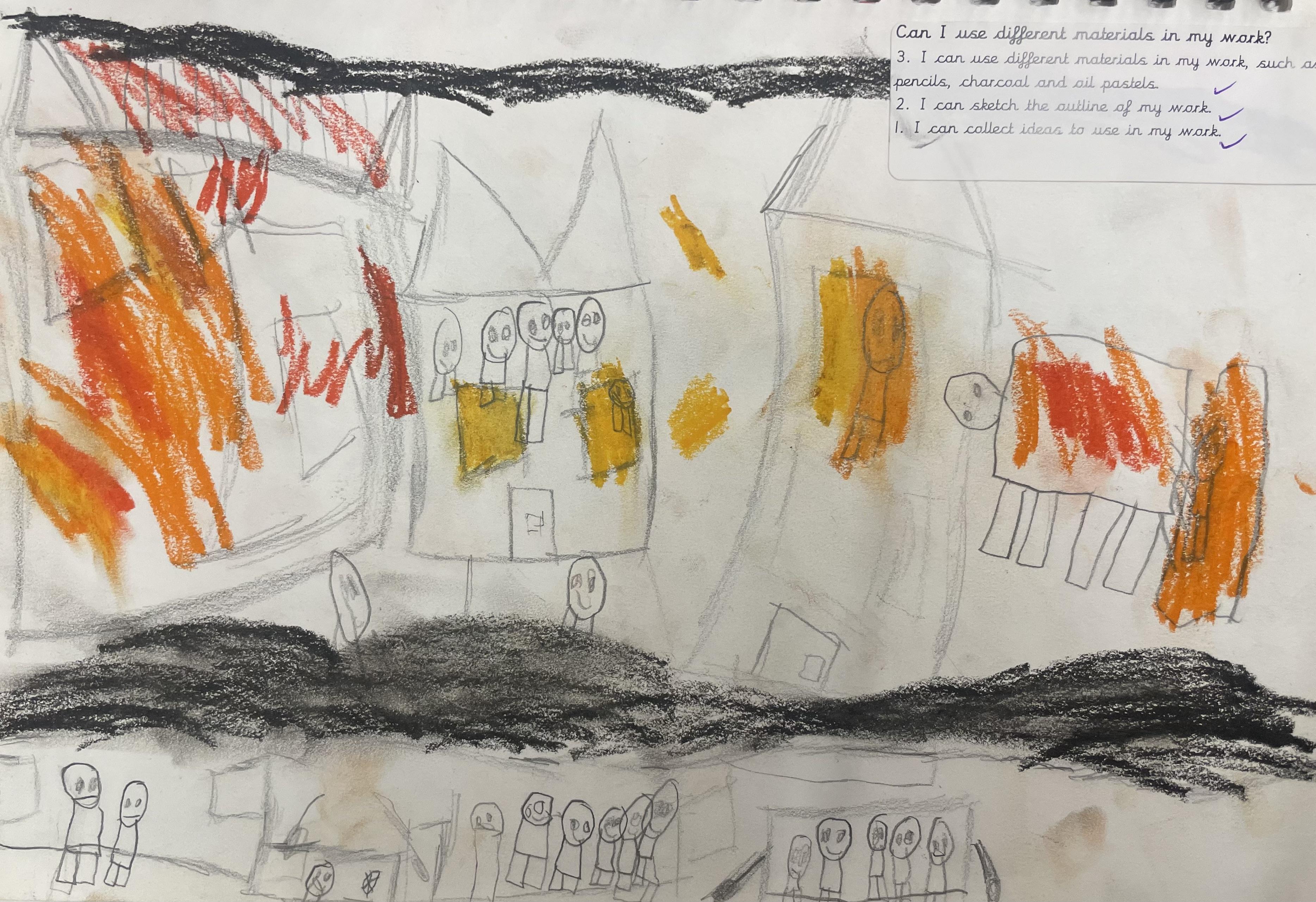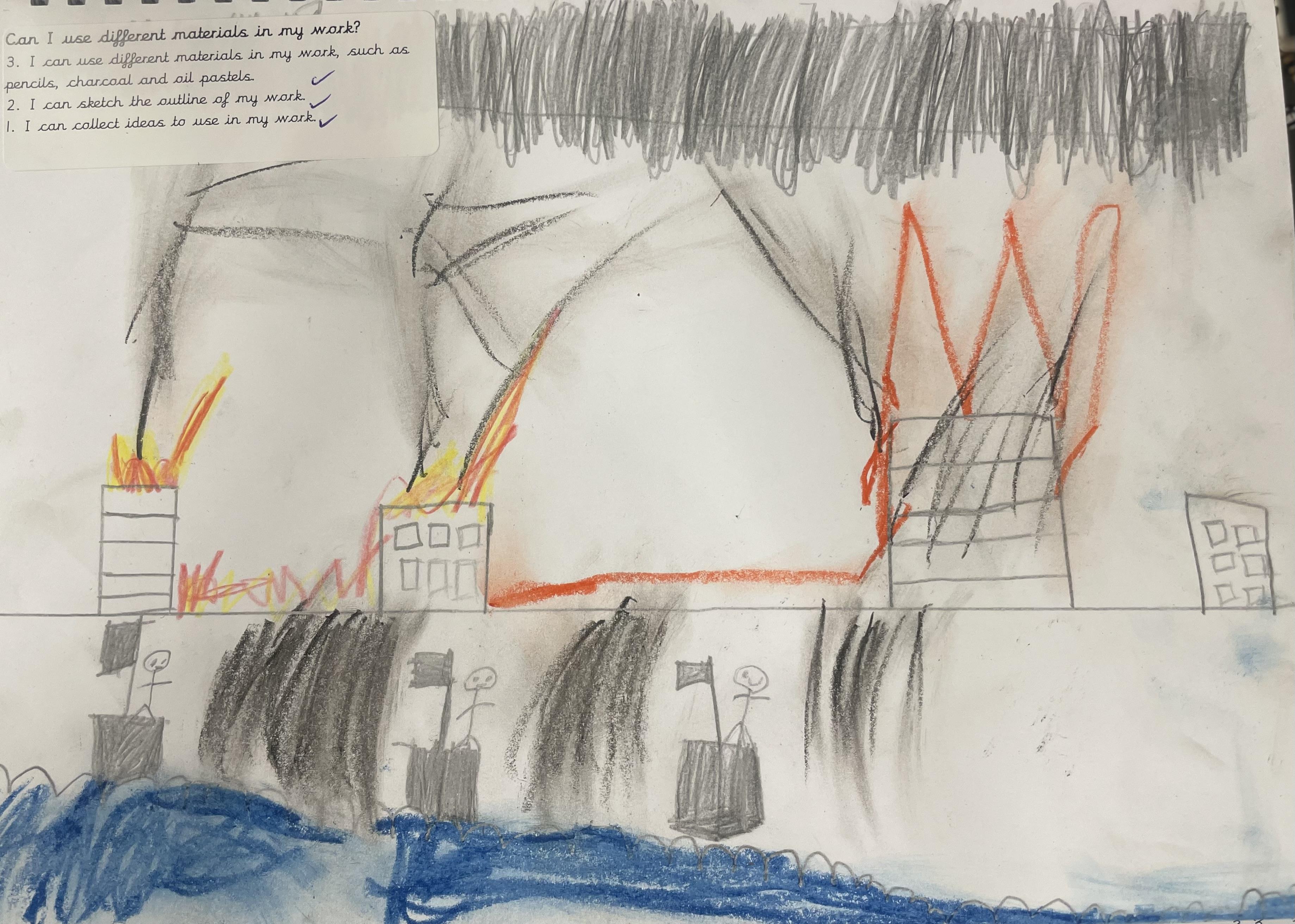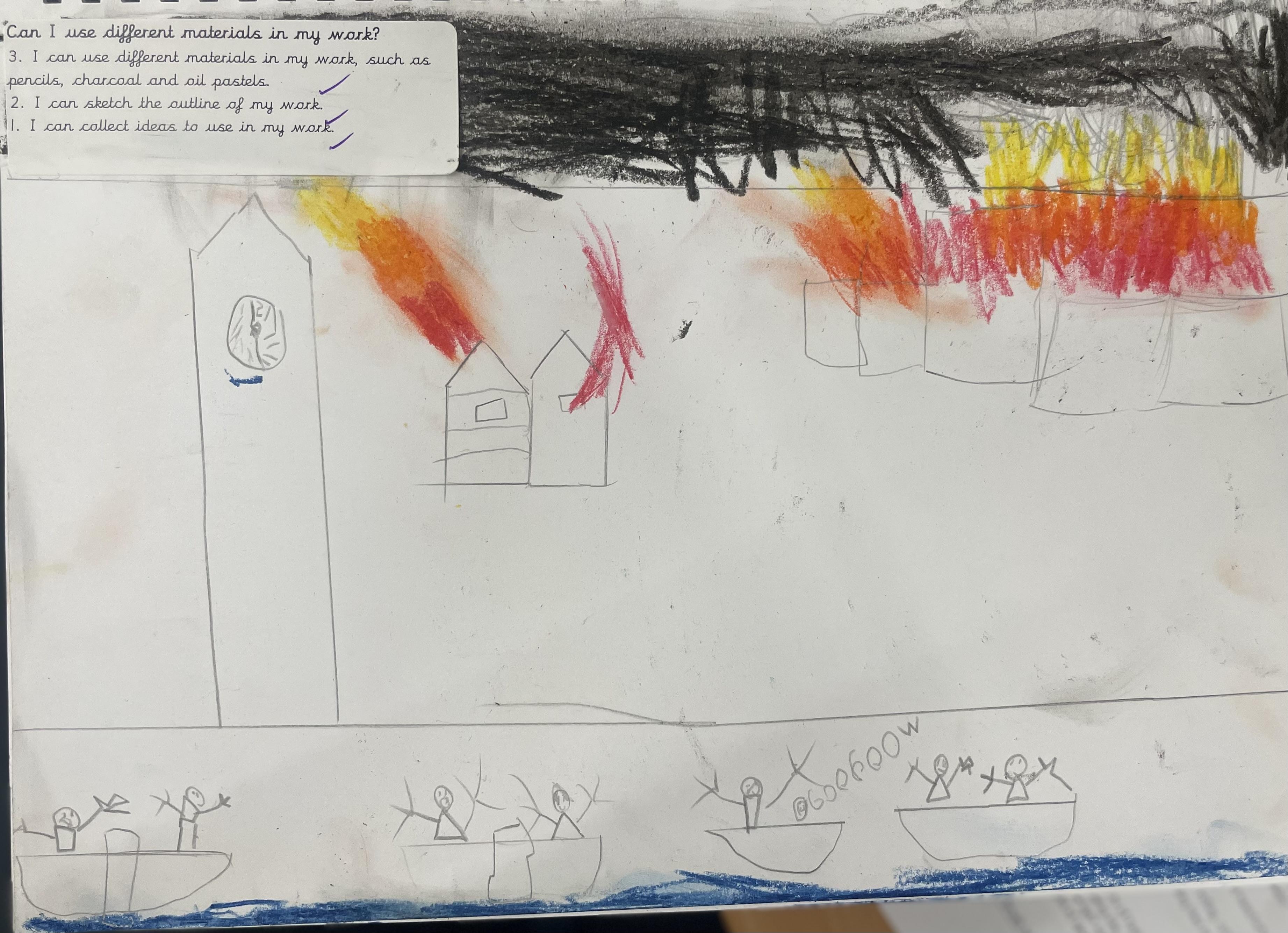 When learning about the Great Fire of London, years 1 and 2 have been creating their own pieces of work inspired by the events. They have used shading, blending and different lines to create their drawings using pencils, pastels and charcoal.