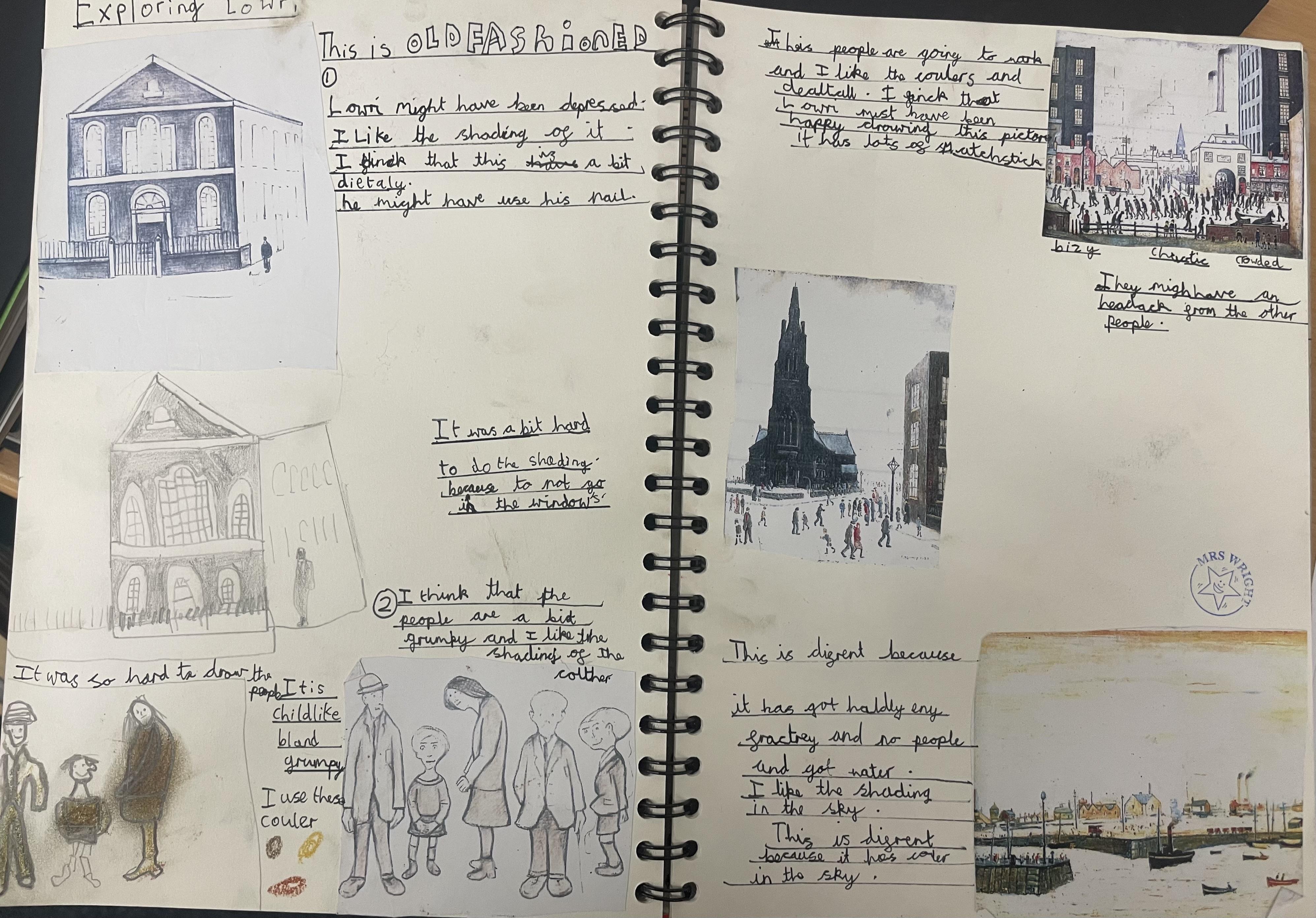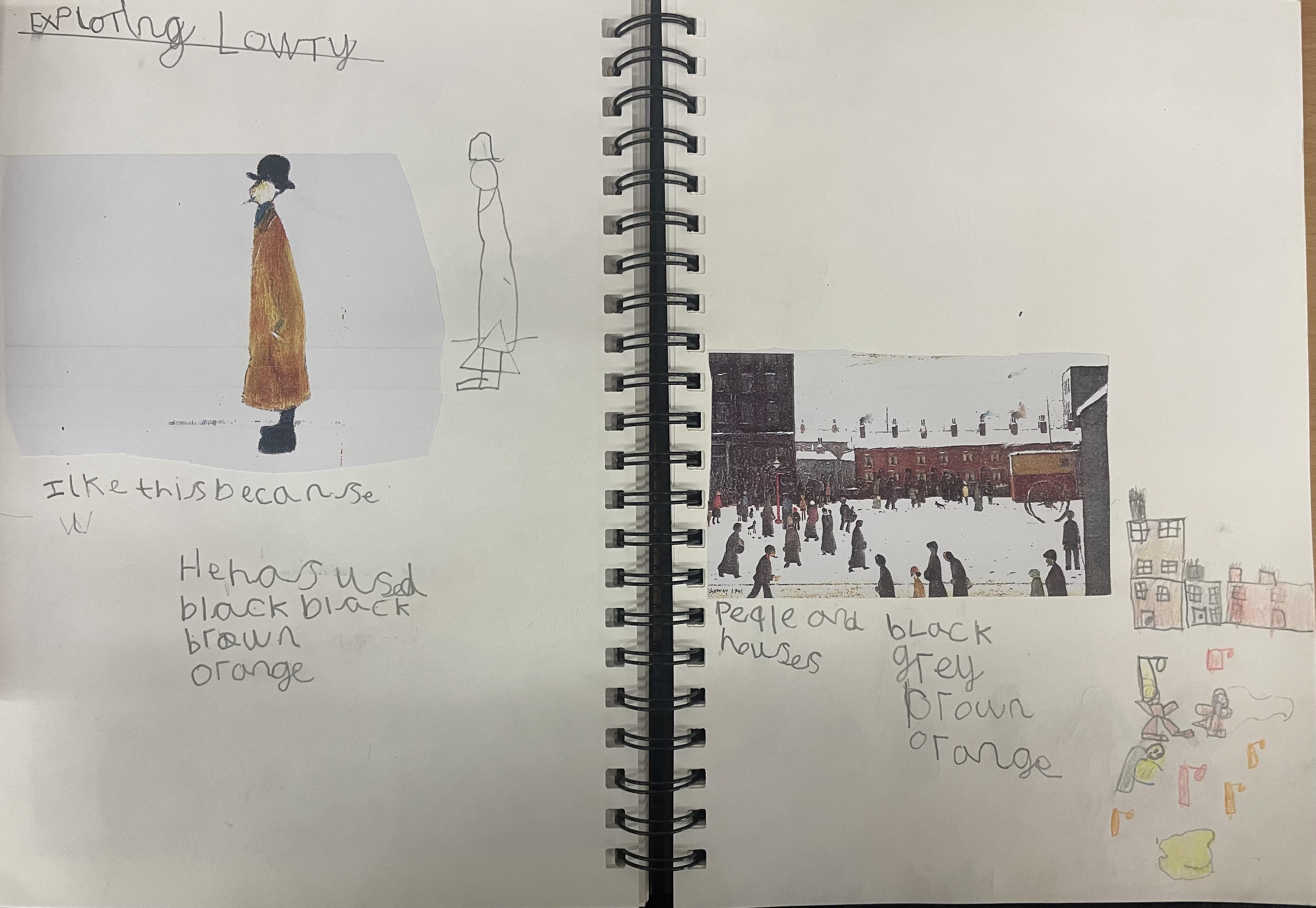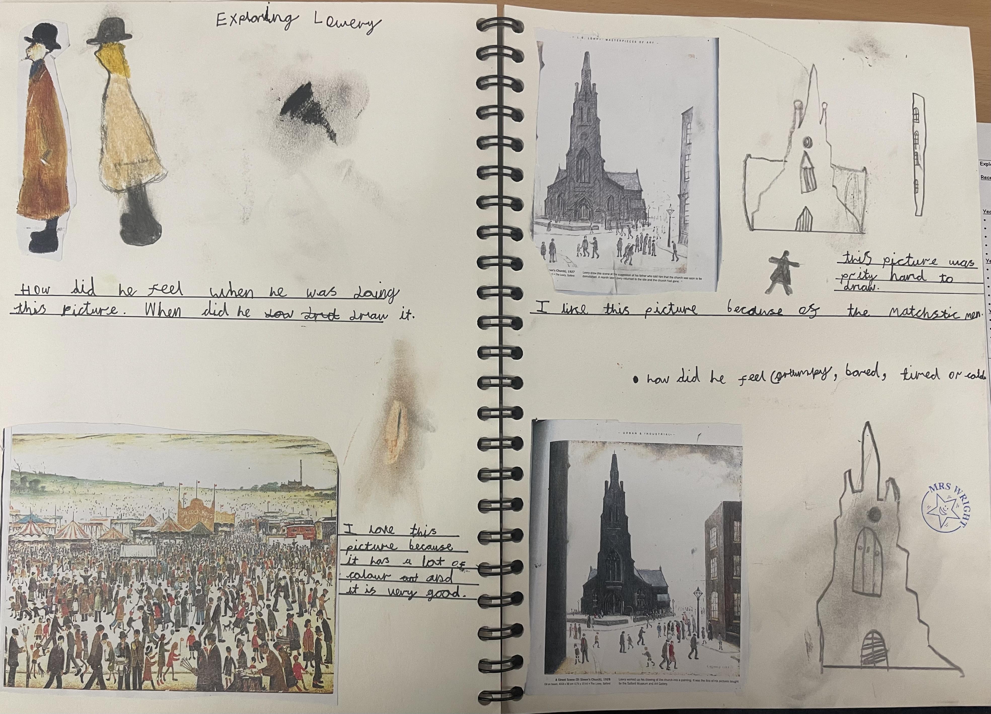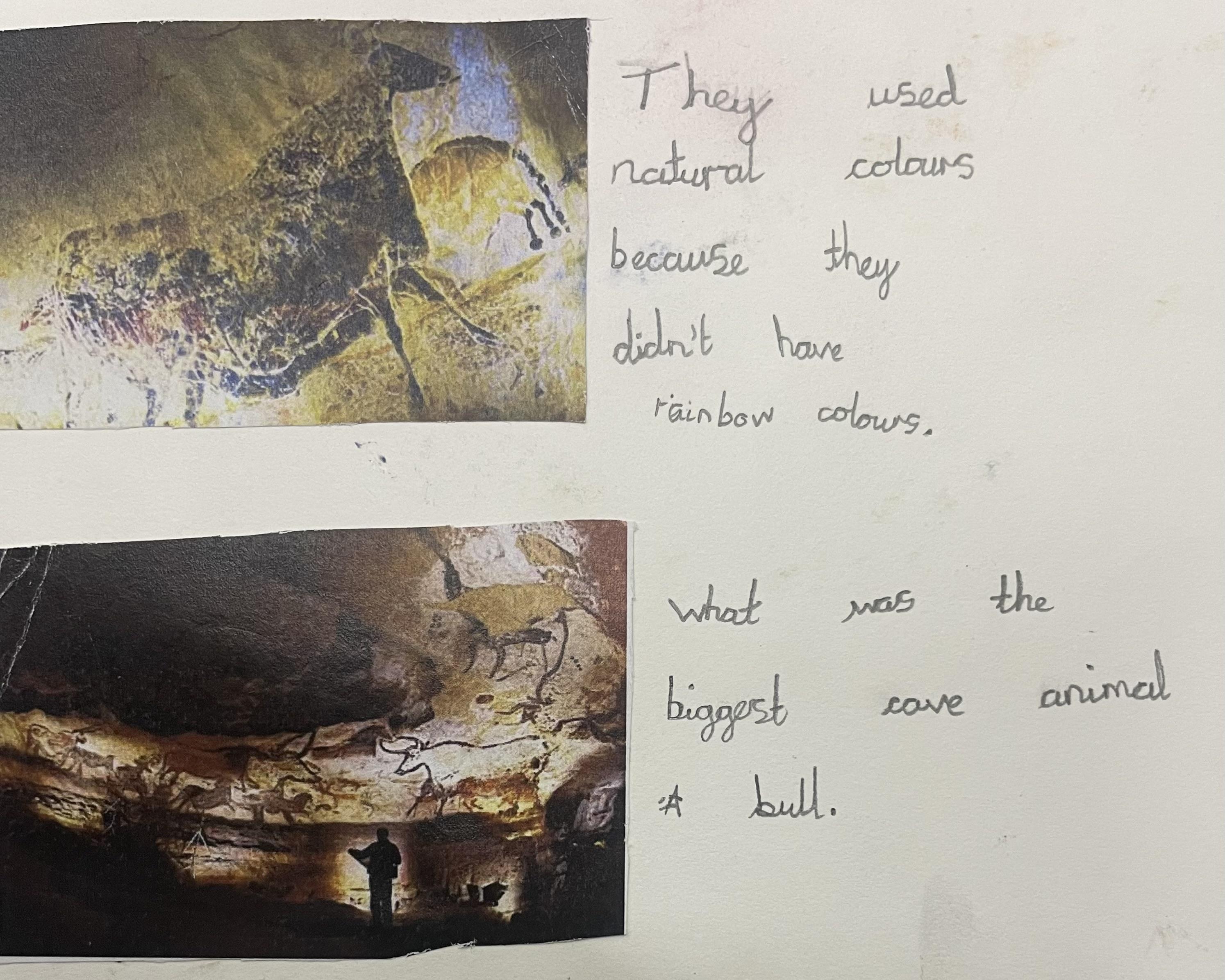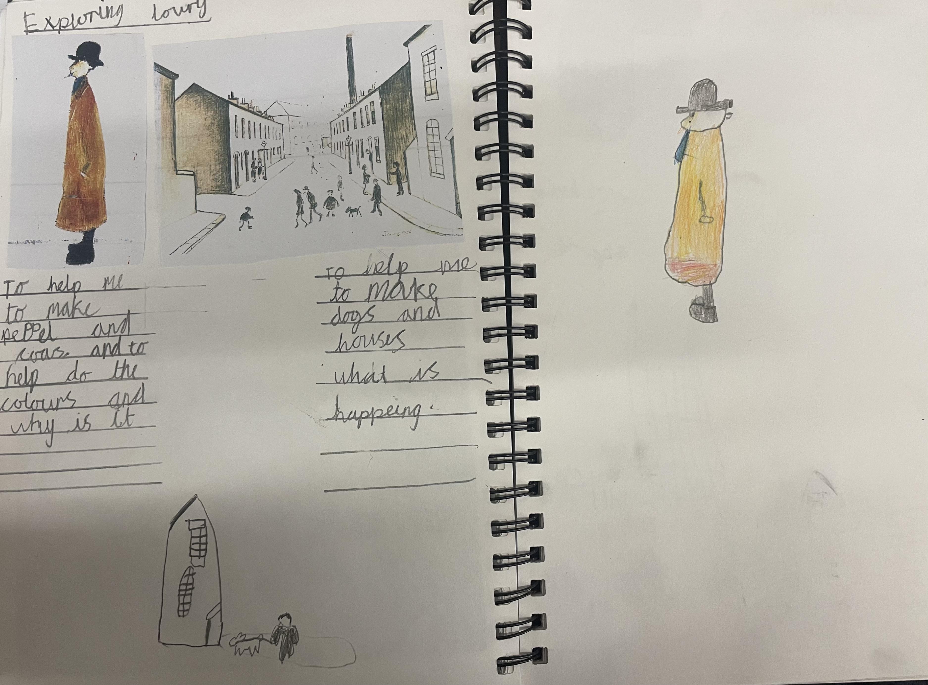 After experimenting in their sketch books, children create their final pieces of artwork. Here are some examples of L.S Lowry inspired drawings where the children applied their shading techniques and used pastels with different grades of pencil, trying to create perspective with 3D elements in their drawings as well as beginning to think about size and scale within their pictures. There are also examples of Stone Age cave painting pictures inspired by the caves of Lascaux.