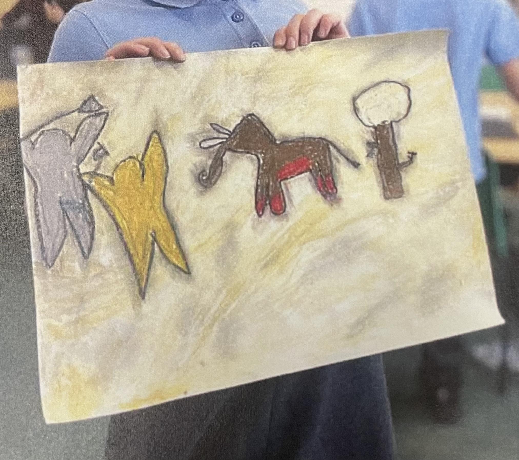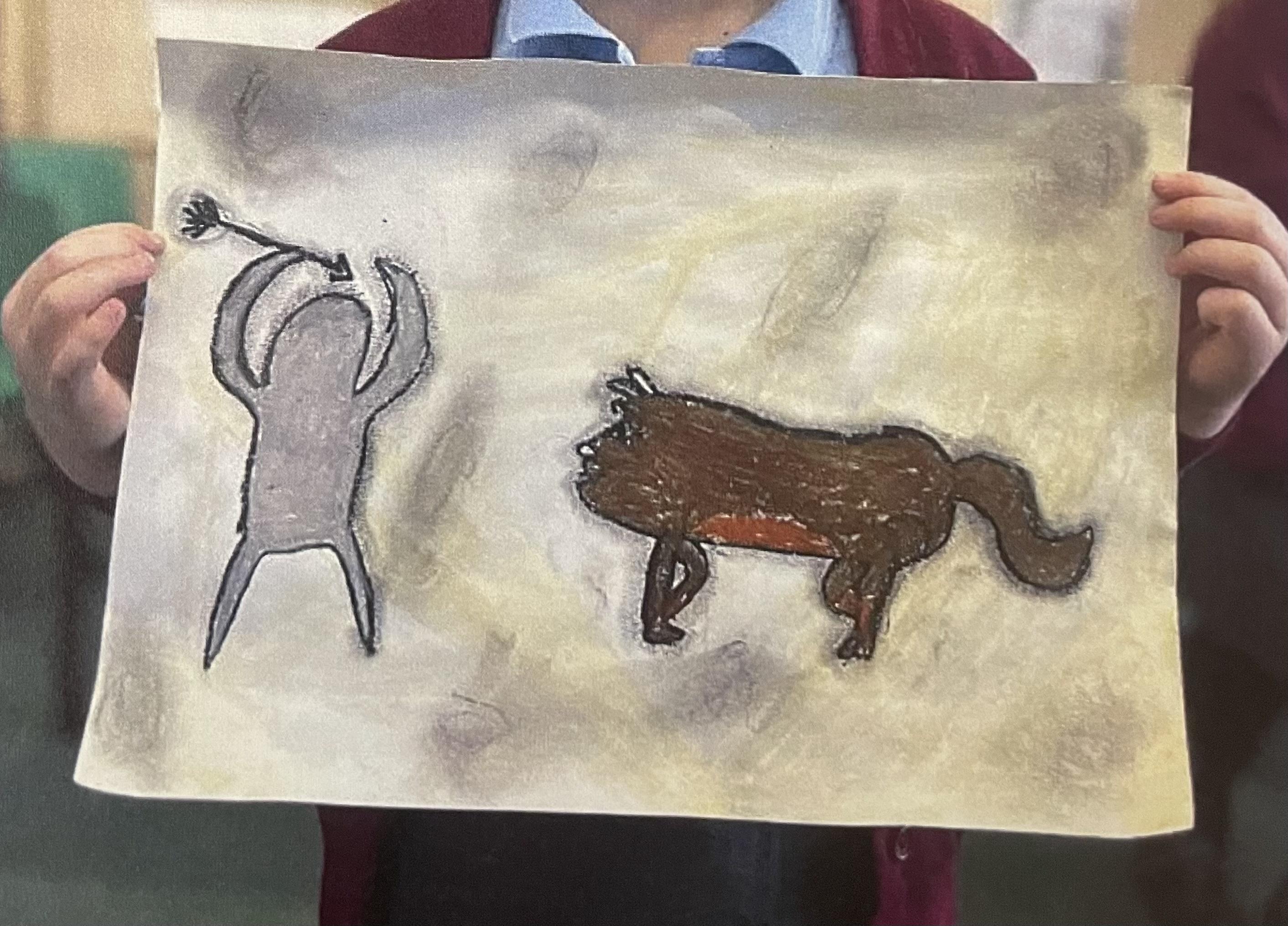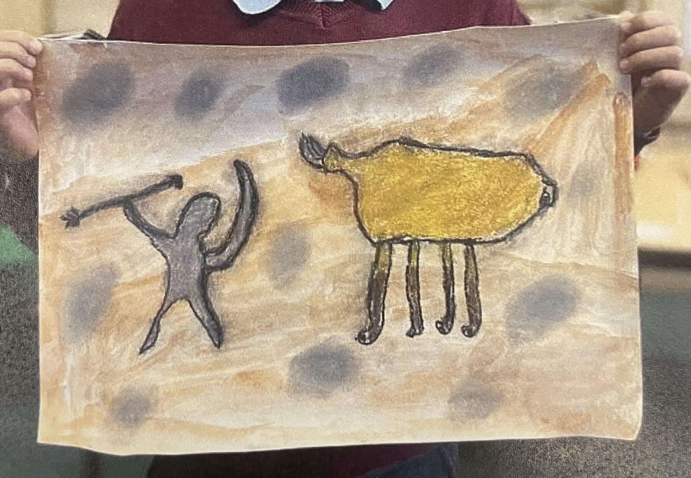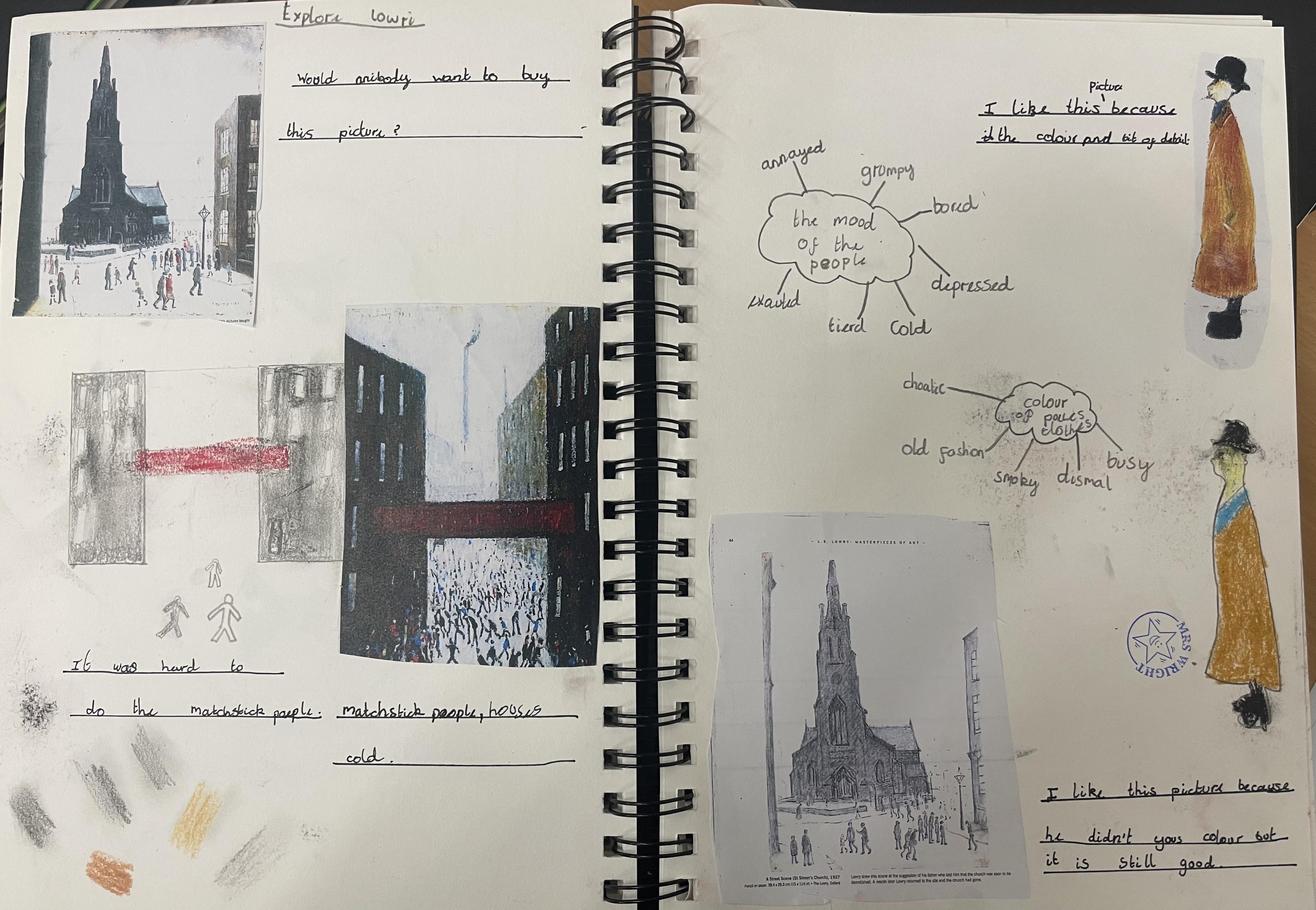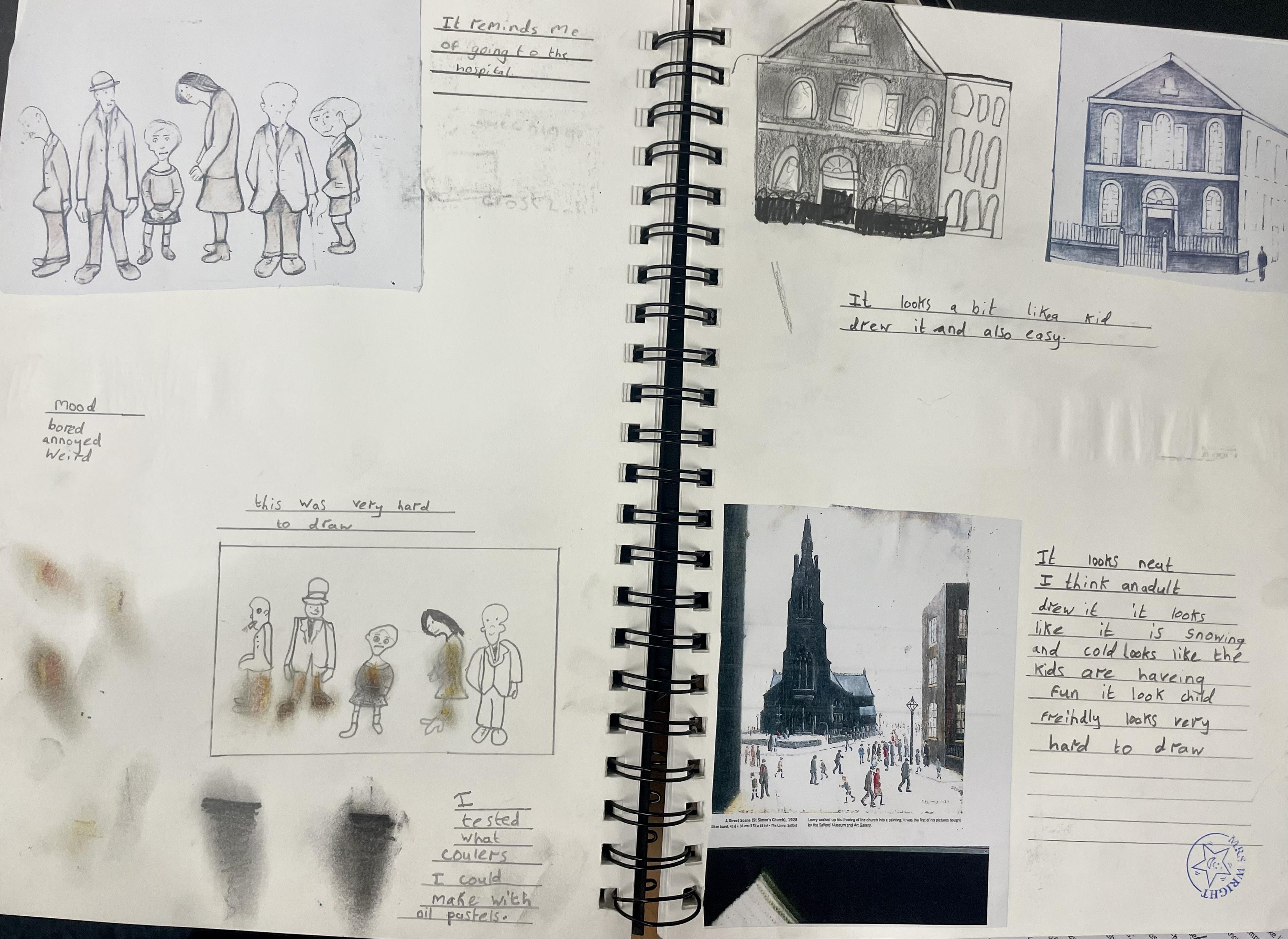 After experimenting in their sketch books, children create their final pieces of artwork. Here are some examples of L.S Lowry inspired drawings where the children applied their shading techniques and used pastels with different grades of pencil, trying to create perspective with 3D elements in their drawings as well as beginning to think about size and scale within their pictures. There are also examples of Stone Age cave painting pictures inspired by the caves of Lascaux.