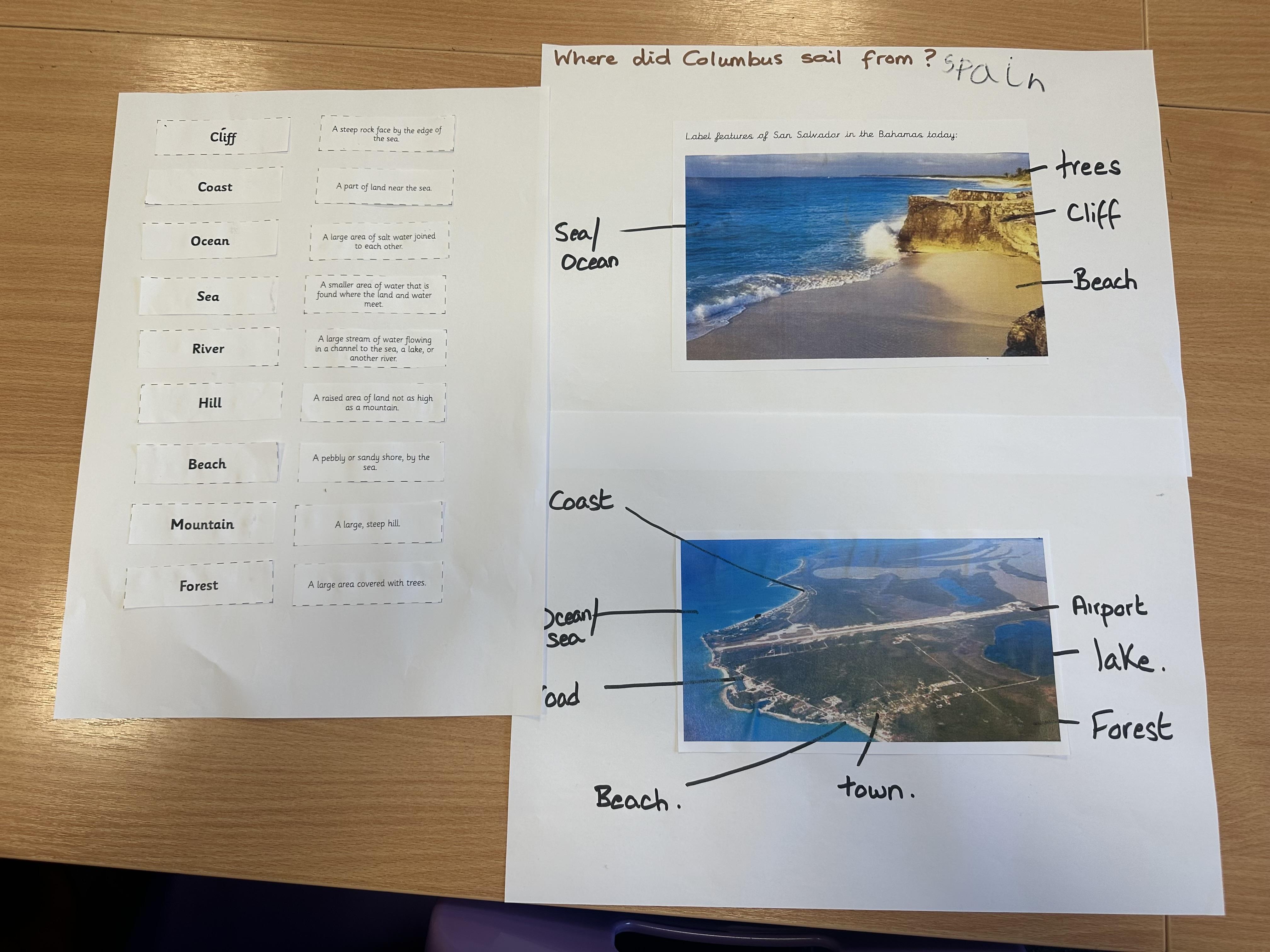 The children are looking at features of and island during their topic on Explorers.  The children were able to label geographical features and describe the island.