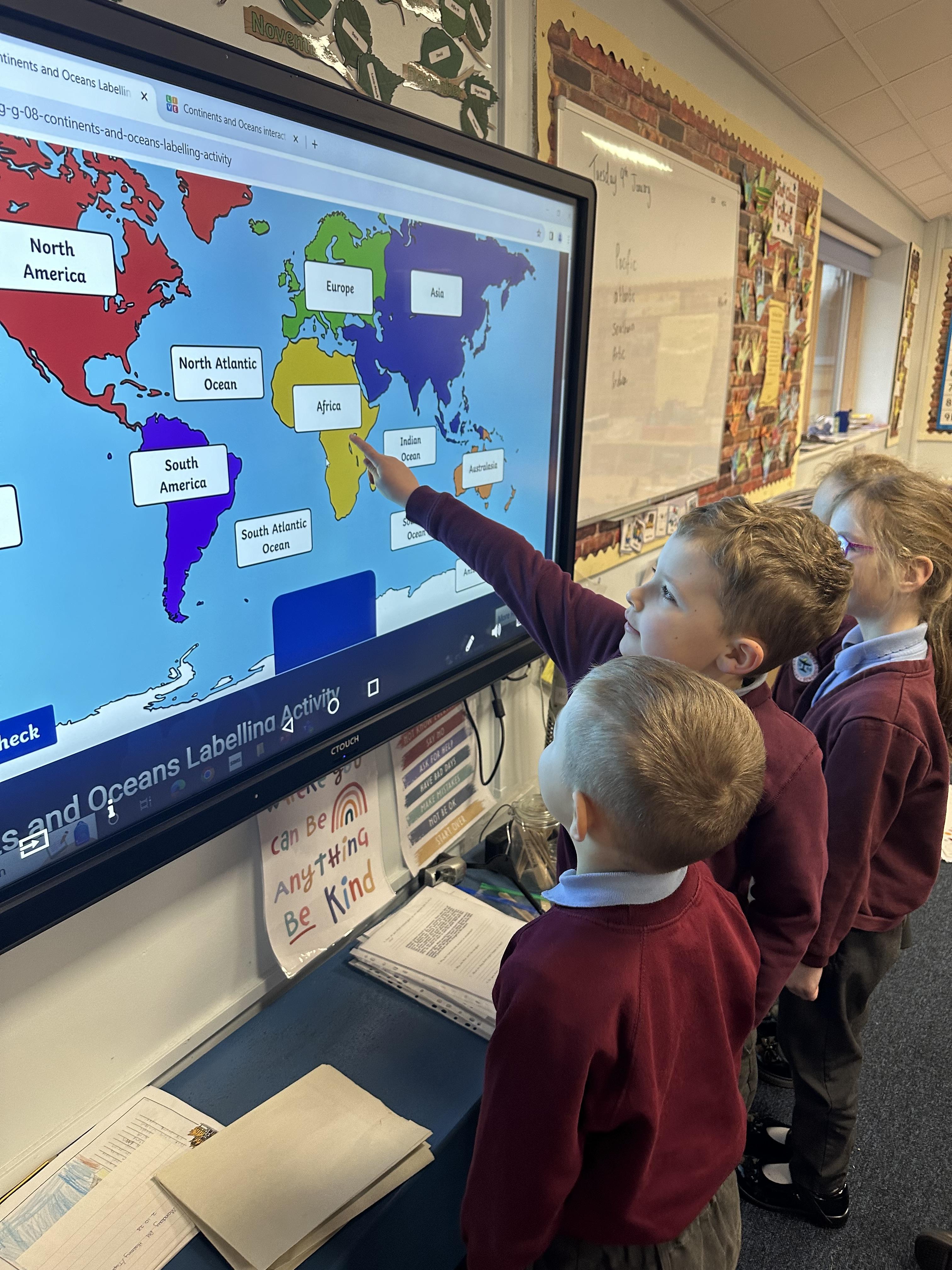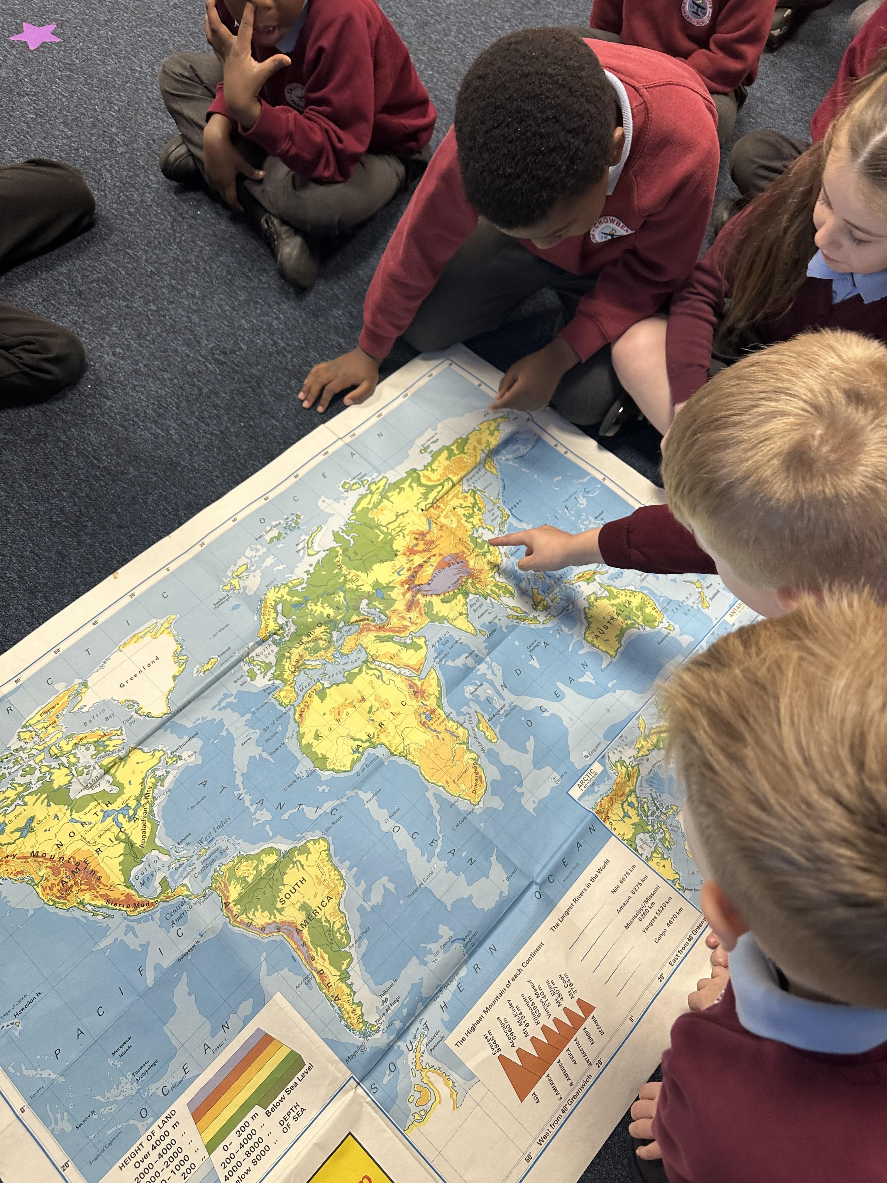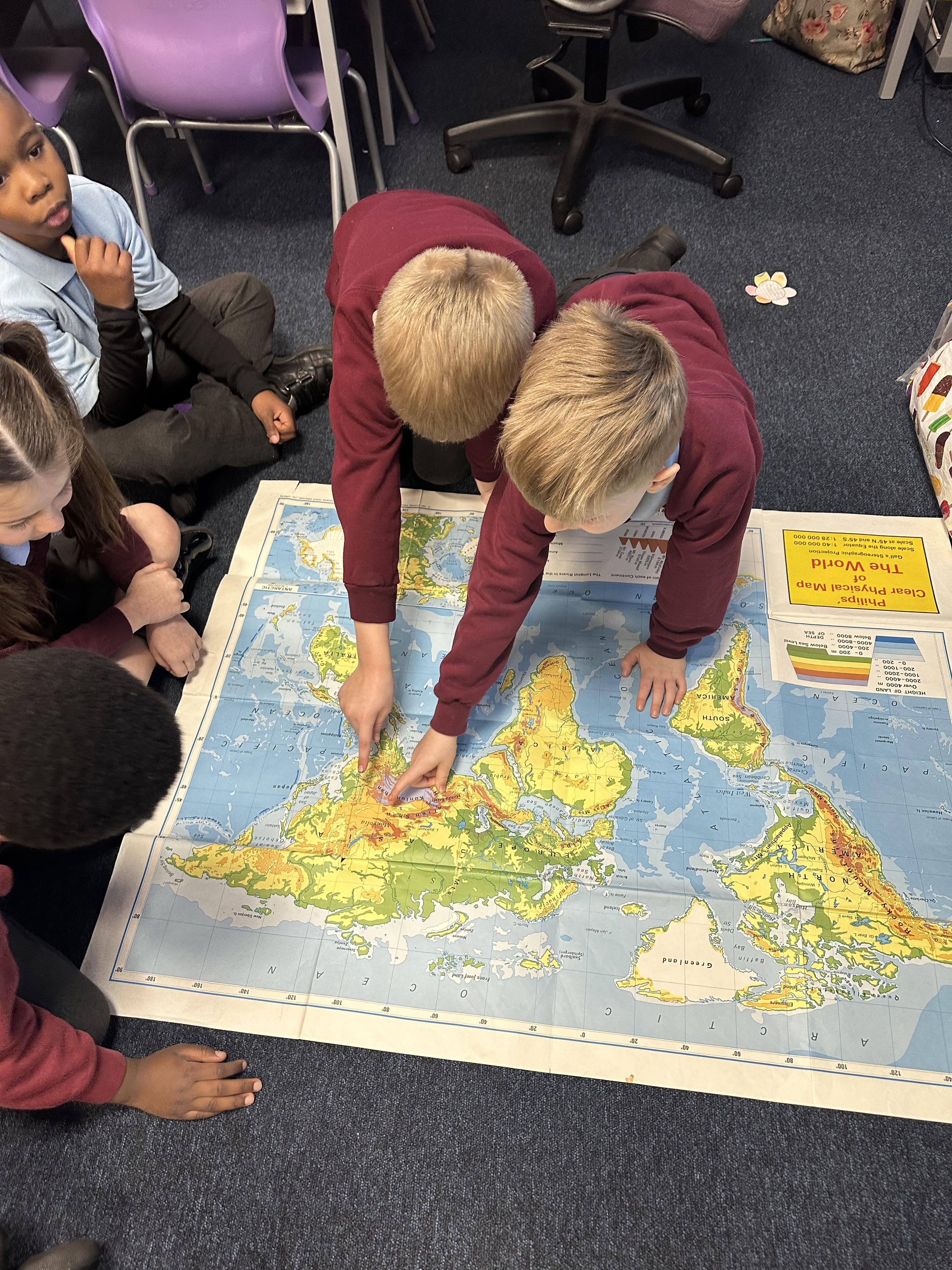The children have been looking at the continents and oceans and finding and labelling them on a map.